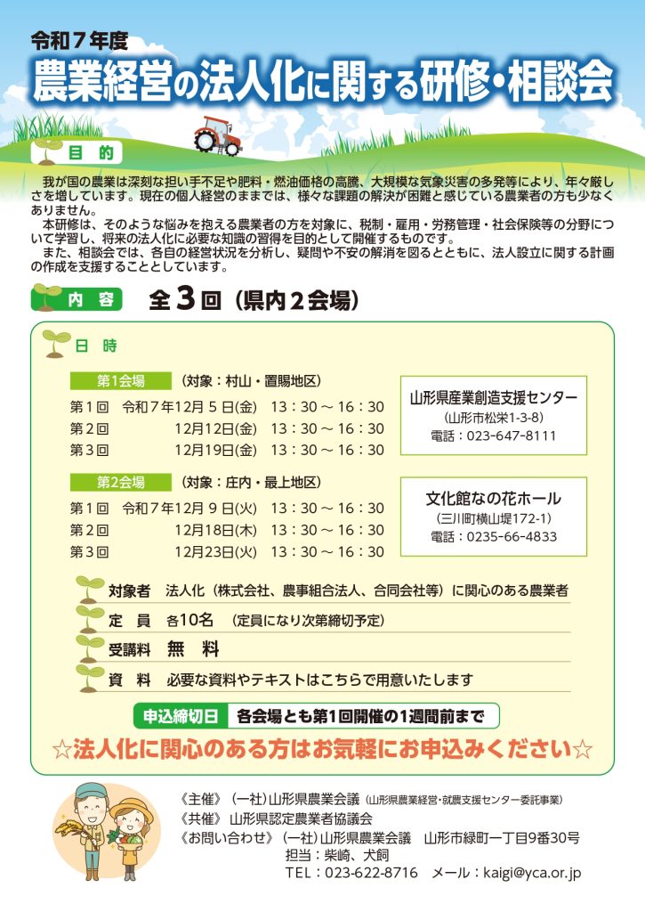 - お知らせNEWS【令和7年度農業経営の法人化に関する研修・相談会】が開催されます。 2025年11月4日