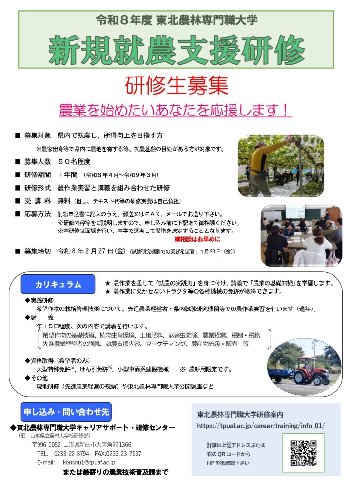 - 【令和8年度 東北農林専門職大学 新規就農支援研修】研修生募集について 2026年1月5日
