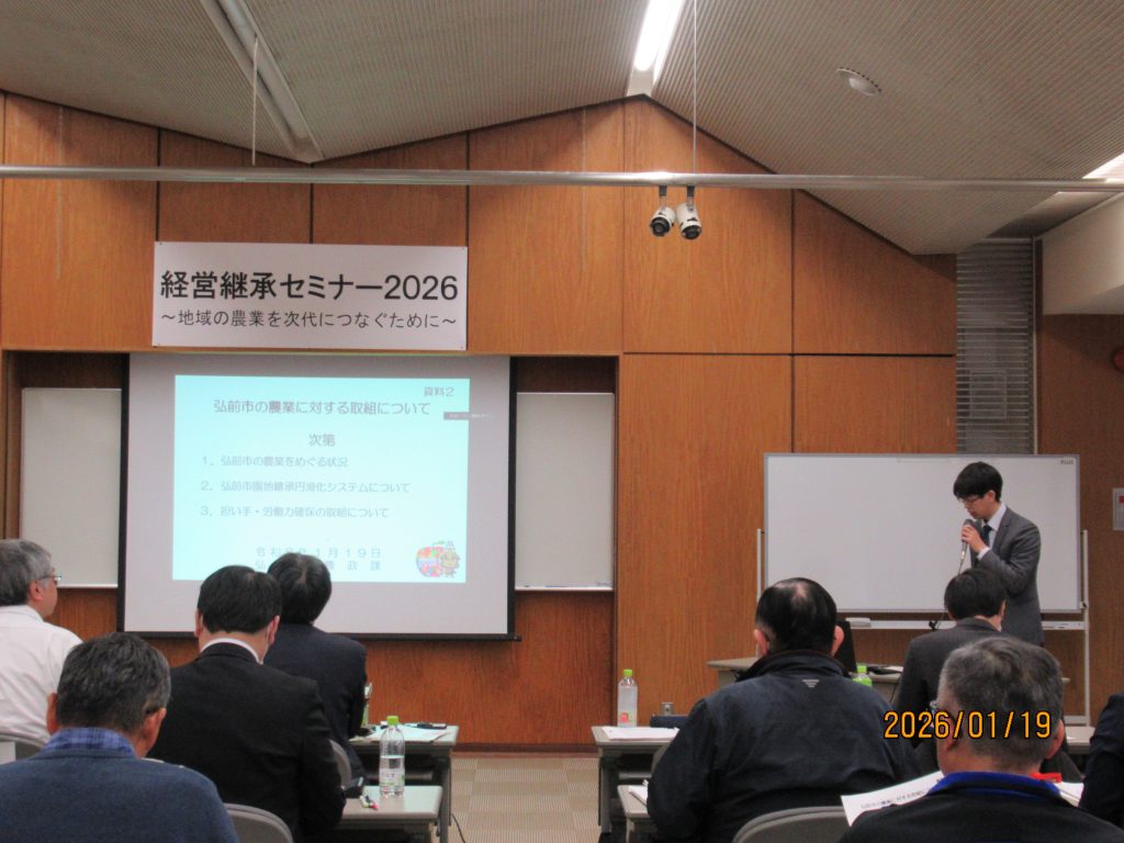 また、ひろさき農業総合支援協議会(弘前市、管内JA、県りんご協会等で構成)が実施している新規参入希望者等を受け入れ、実践的な技術指導等を行う「農業里親研修事業」についてご紹介いただきました。